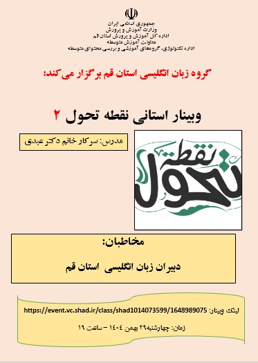 وبینار استانی نقطه تحول 2 منتشر شده در دوشنبه, 28 بهمن 1404 09:33 گروه زبان انگلیسی استان قم برگزار می کند: