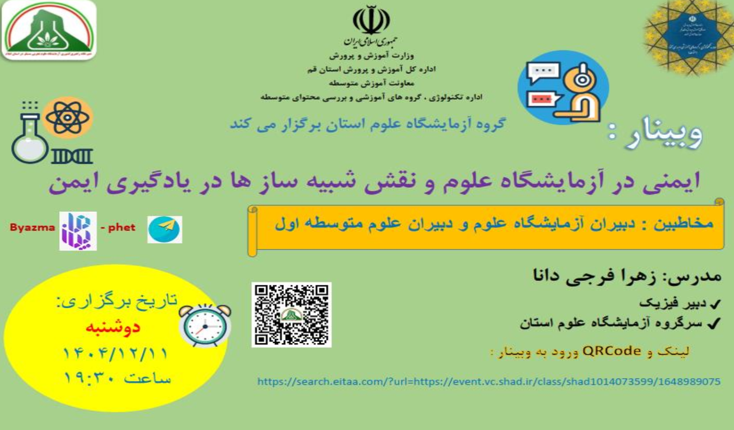 وبینار استانی، ایمنی درآزمایشگاه علوم منتشر شده در پنج شنبه, 08 اسفند 1404 20:10 ایمنی در آزمایشگاه علوم 🧪و بررسی دو شبیه ساز( phet -byazma ) در یادگیری ایمن